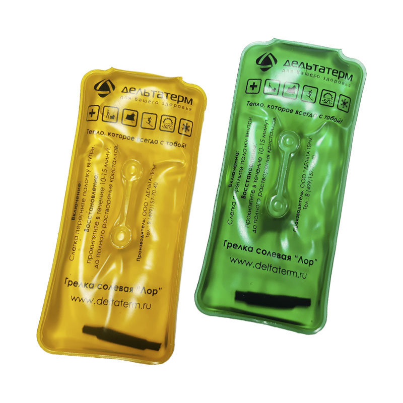 Солевая грелка - очень прочная пленка ПВХ, наполненная раствором соли - ацетатом натрия. В растворе плавает палочка-пускатель, которую достаточно слегка перегнуть и моментально начинается процесс кристаллизации соли с выделением тепла до температуры +52°C. Для того чтобы восстановить многоразовое изделие, необходимо положить его в емкость с водой, довести до кипения и кипятить в течение 10-15 минут до полного растворения кристаллов и оно снова готово к работе.